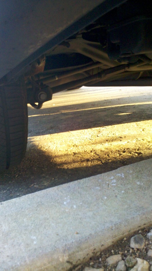 I stuck my phone under the car and snapped this shot. It’s like a Where’s Waldo book. Can you find it in the picture? Turns out, the rooster was not stuck. It was just scared of the people walking around. Once we left it alone, it came out, and the staff at the mental hospital came over, put it in a straight jacket, and took it back.