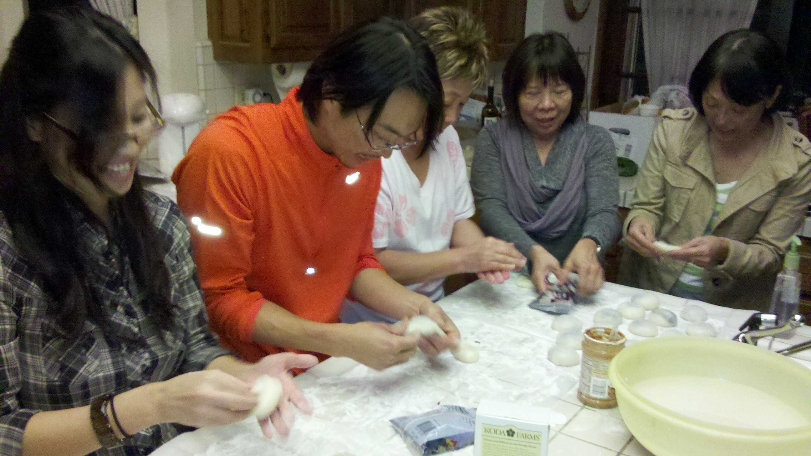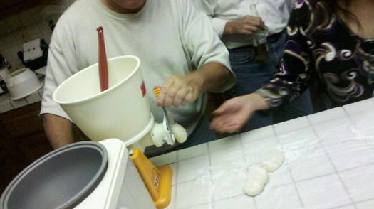 My uncle Ken working the mochi-cutter. He worked hard making all the mochi loafs. We were too weak-sauce to touch the loaf to cut it like my grandma used to. WAY too hot.This is what the loaf looks like inside the cutting machine. We'd take the loaf out of the mochi maker (which cooked and kneaded the sweet rice), then put it in here. My job was to scoop the loaf in here and cut it into equal pieces.Far making mochi. It was her first time and she did an amazing job! Her mochi were the perfect shape and had the right amount of anko inside. She would make a good Japanese person. haha. You can see the anko as she folds the mochi. The best anko is the smooth kind without the bits of skin in it (according to me). I'm picky about my anko. My aunt affectionately calls it "unko"... she says it looks like unko. She's right... it does. (note: unko is poop in Japanese)The rest of the family (and friends) making mochi. We had a little production shop in my auntie Donna's kitchen.The finished product. Homemade mochi is way better than store-bought. It's slightly more firm, and tastes more "pure", if you know what I mean. There are no preservatives, so the mochi gets moldy if you don't put it in the fridge/freezer... but it's better for you - just rice and anko. It's definitely the best the day you make it, so I ate like 5 or 6 that night. haha. The rest I put on ice... to be reheated and eaten with shoyu and sugar at a later time!