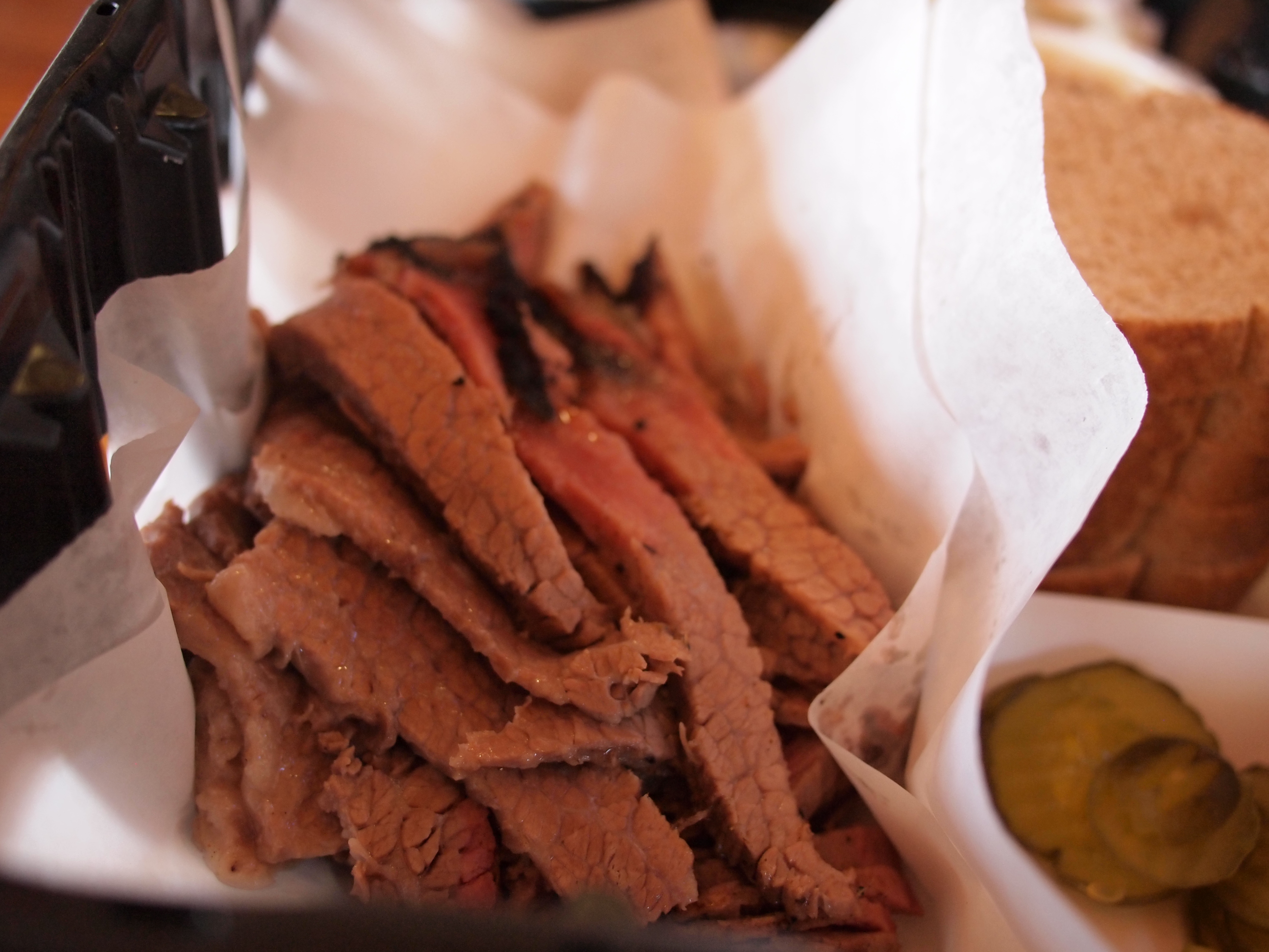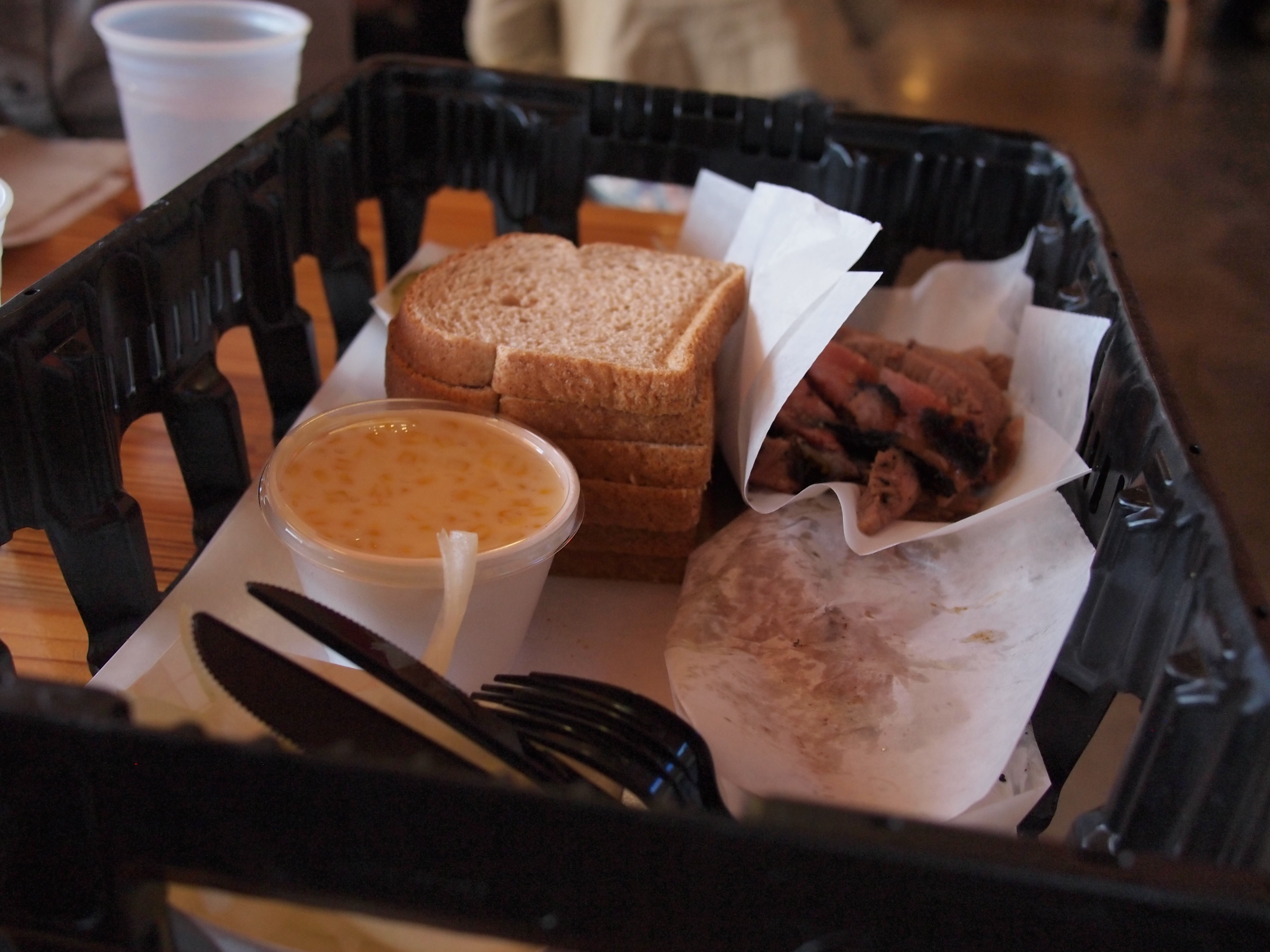 Rudy’s bbq in Houston. They serve food in a crate. I’ve always heard that if you want to lose weight, you should use a smaller plate to control your portions. Rudy’s is counter-productive for this method of weight-loss (or any other method). Creamed corn was good. You can also ask for as many slices of bread as you want. Some people left with a whole loaf. wow.