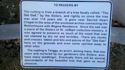 During our 4 hours of solitude on the campus of the Center for Spiritual Development in Orange County, I thought about what it meant to become oaks of righteousness. As I was wandering around the Center grounds, I came upon a young oak planted by the nuns at the convent.