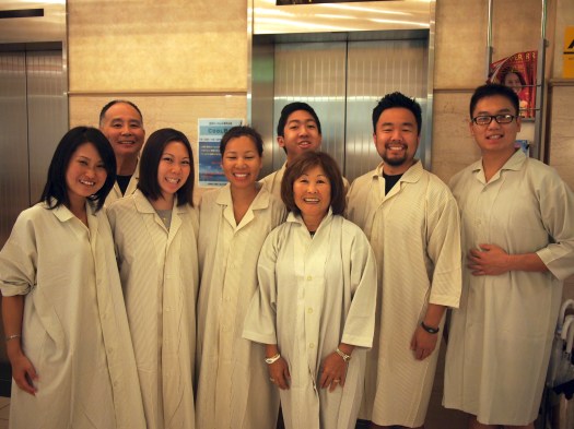 From left to right: Tomomi Onaya, Wayne Muramatsu, Janelle Tom, Erika Wong, Makito Umekita, Judie Jue, myself, and Martin Au-Yeung. We found these robes in one of our hotels and decided they were just what we needed to take a great picture.