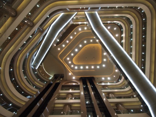 The view from one of the malls (Times Square). What do you see? Skyscrapers and old apartment buildings.The malls in HK are beautiful and they’re all many levels high. This one had floating escalators… making the view from the bottom floor really interesting.