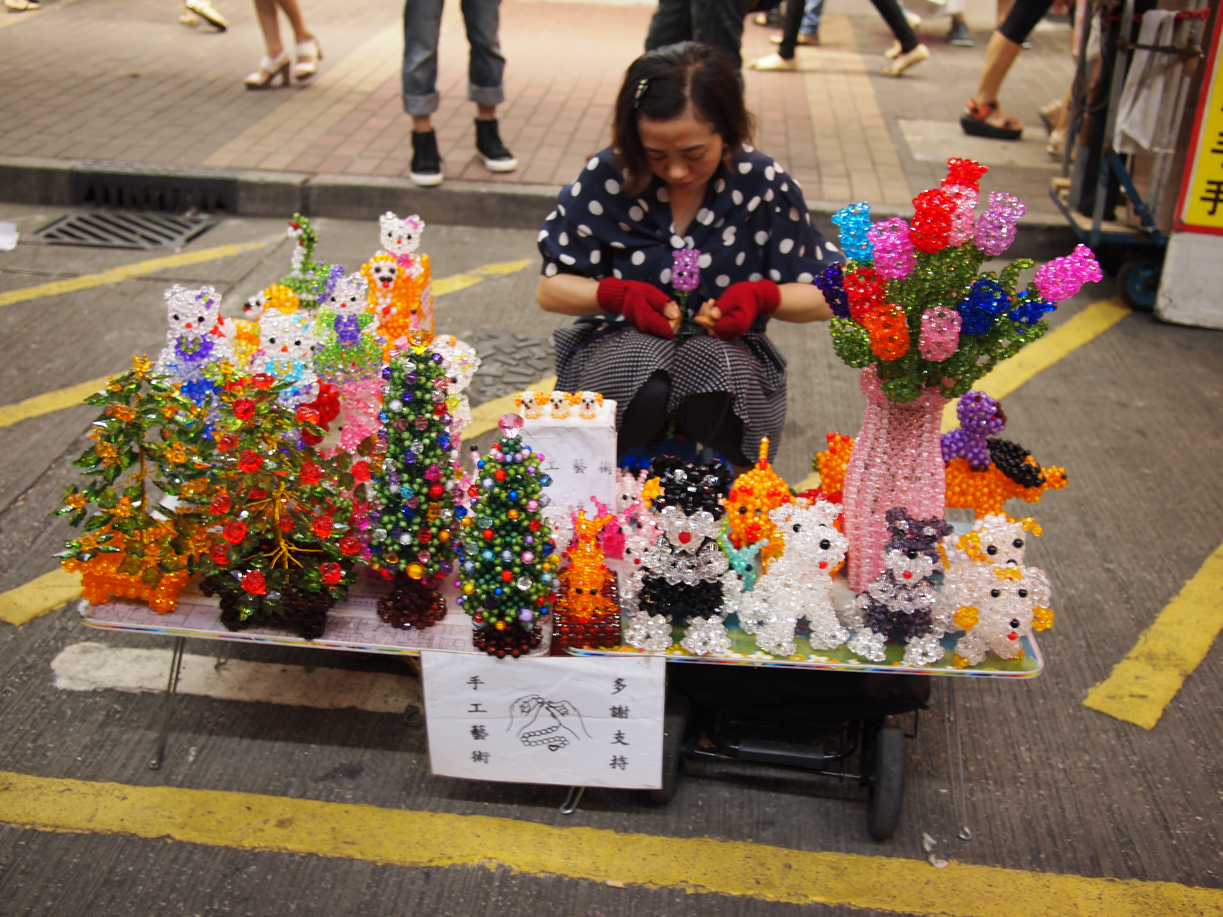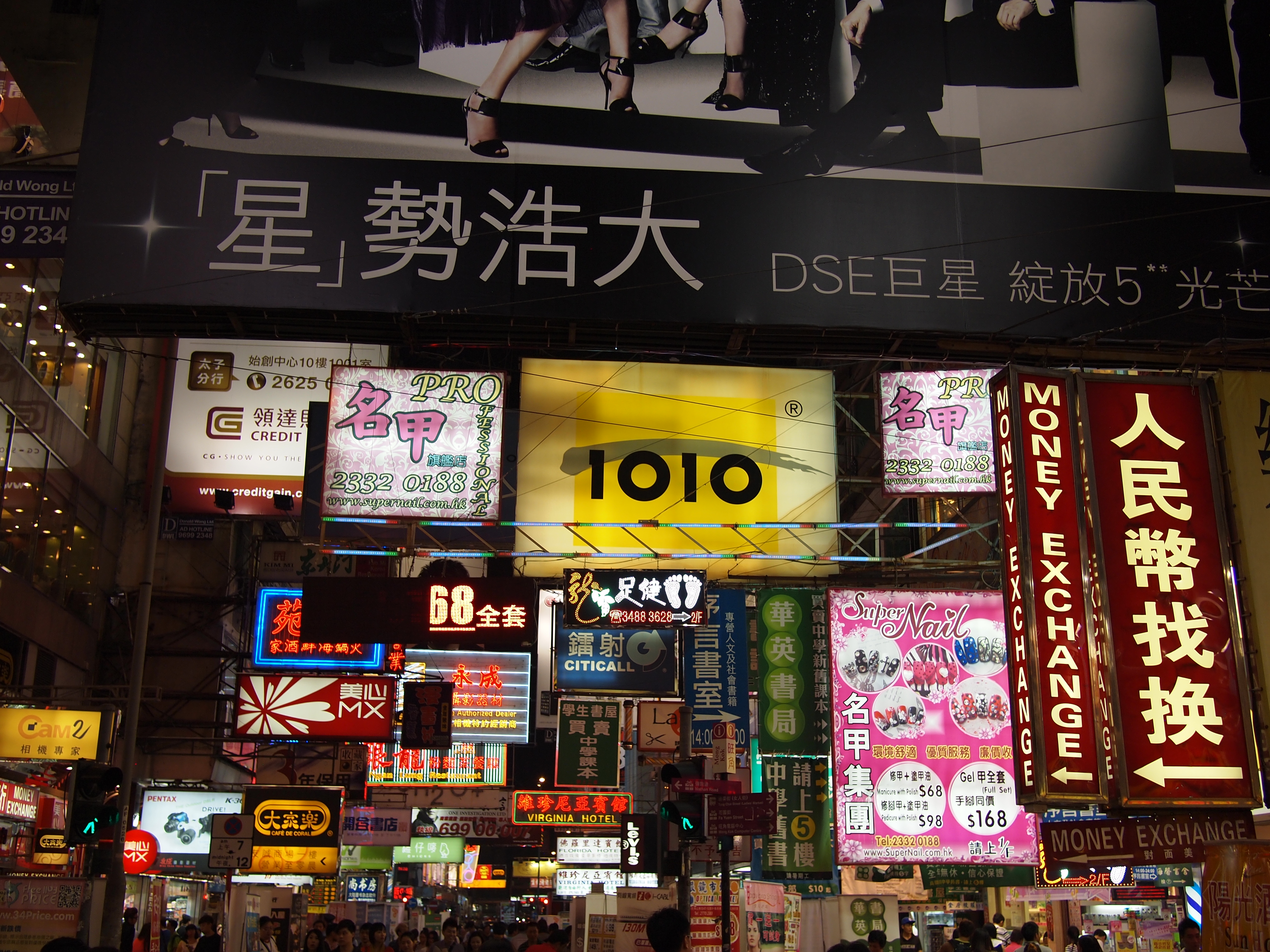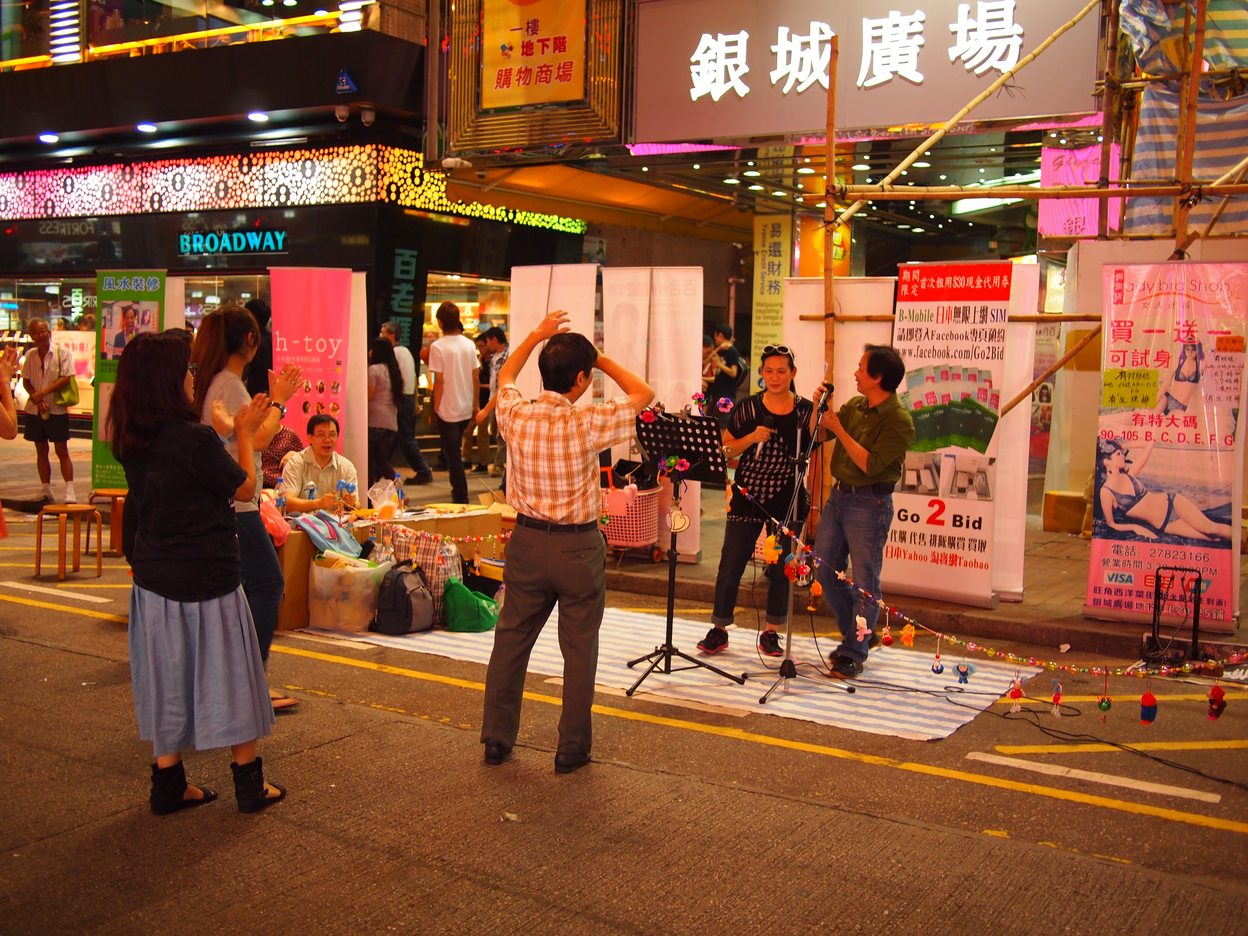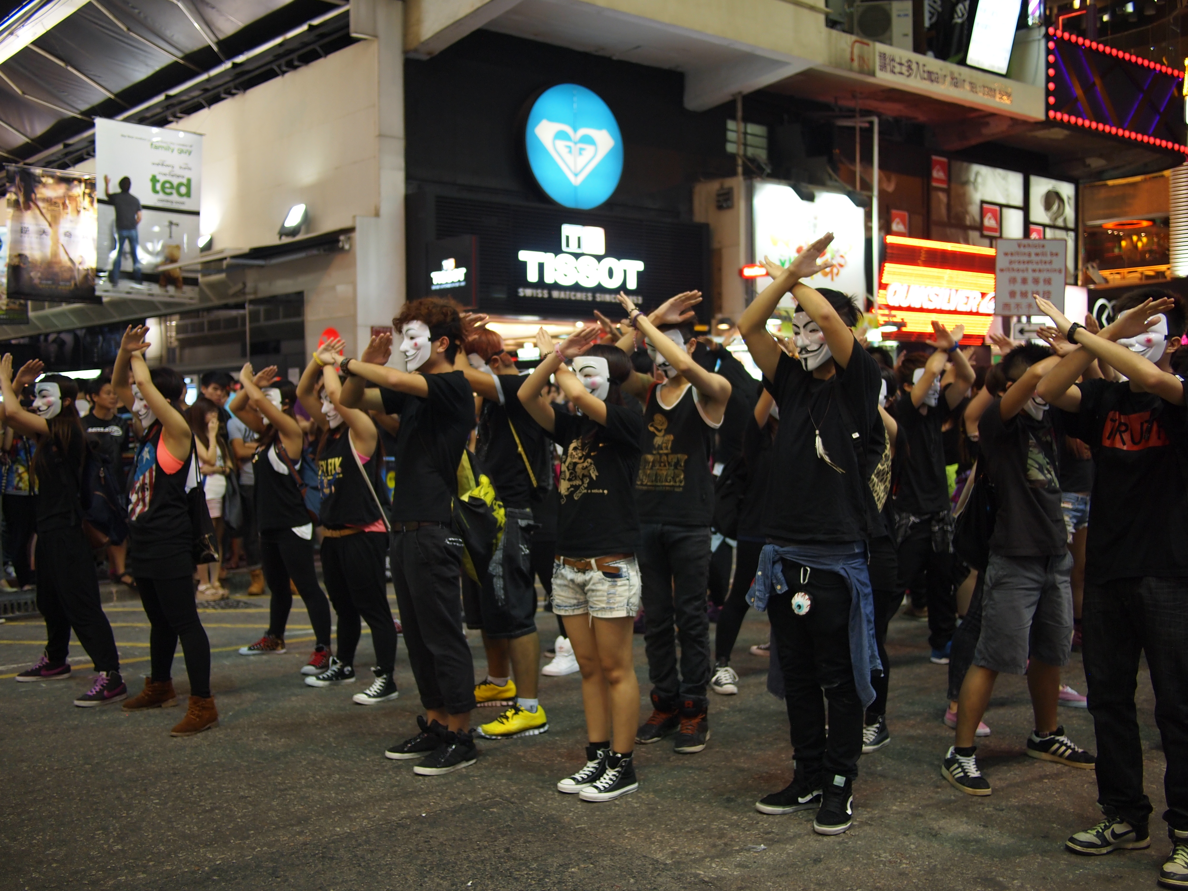 The streets of Hong Kong come alive at night!There were tons of singers set up along the streets singing. Most of the time it sounded more like karaoke than a concert. This musical duo had 3 enthusiastic fans.This lady is spending a lot of time making those glass flowers… I hope someone buys them!This is called “too many signs”. This was not even a main street. Definitely sensory overload for a foreigner like me.The shopping area was big and full of cheap products. They had some good deals on Toms shoes, but I had the sneaking suspicion that these HK vendors wouldn’t send a pair of shoes to a child in need. Kinda defeats the purpose.What time is it? Time to buy a watch.My favorite picture. Business is REAL slow tonight for this poor guy. This is what I looked like when I tried to do math homework at midnight in high school… asleep on the calculator.While we were headed out of the market, a group of students assembled from out of nowhere. They did this dance with “V for Vendetta” masks, then just dispersed and disappeared into the crowd. Selene told us that they were protesting against the education system in HK, using the “V” masks as a sign of rebellion and revolution.