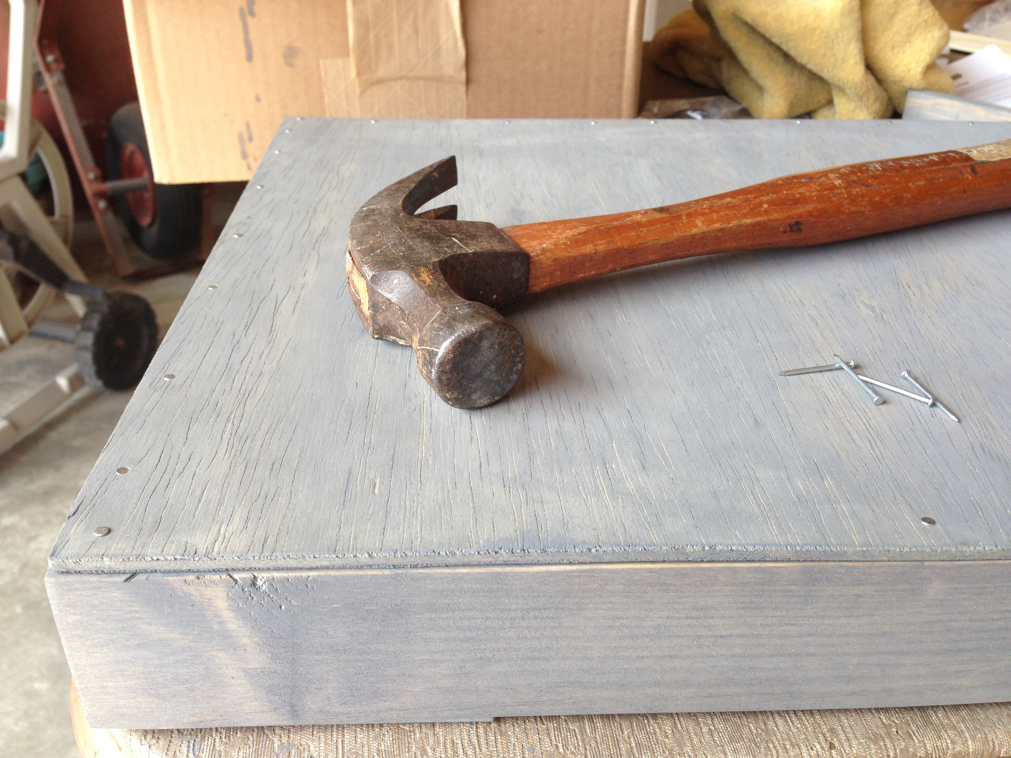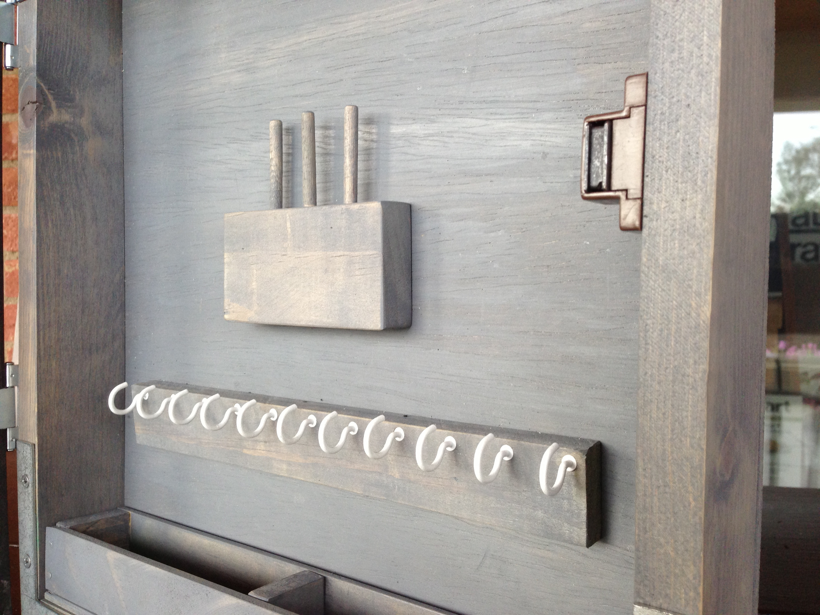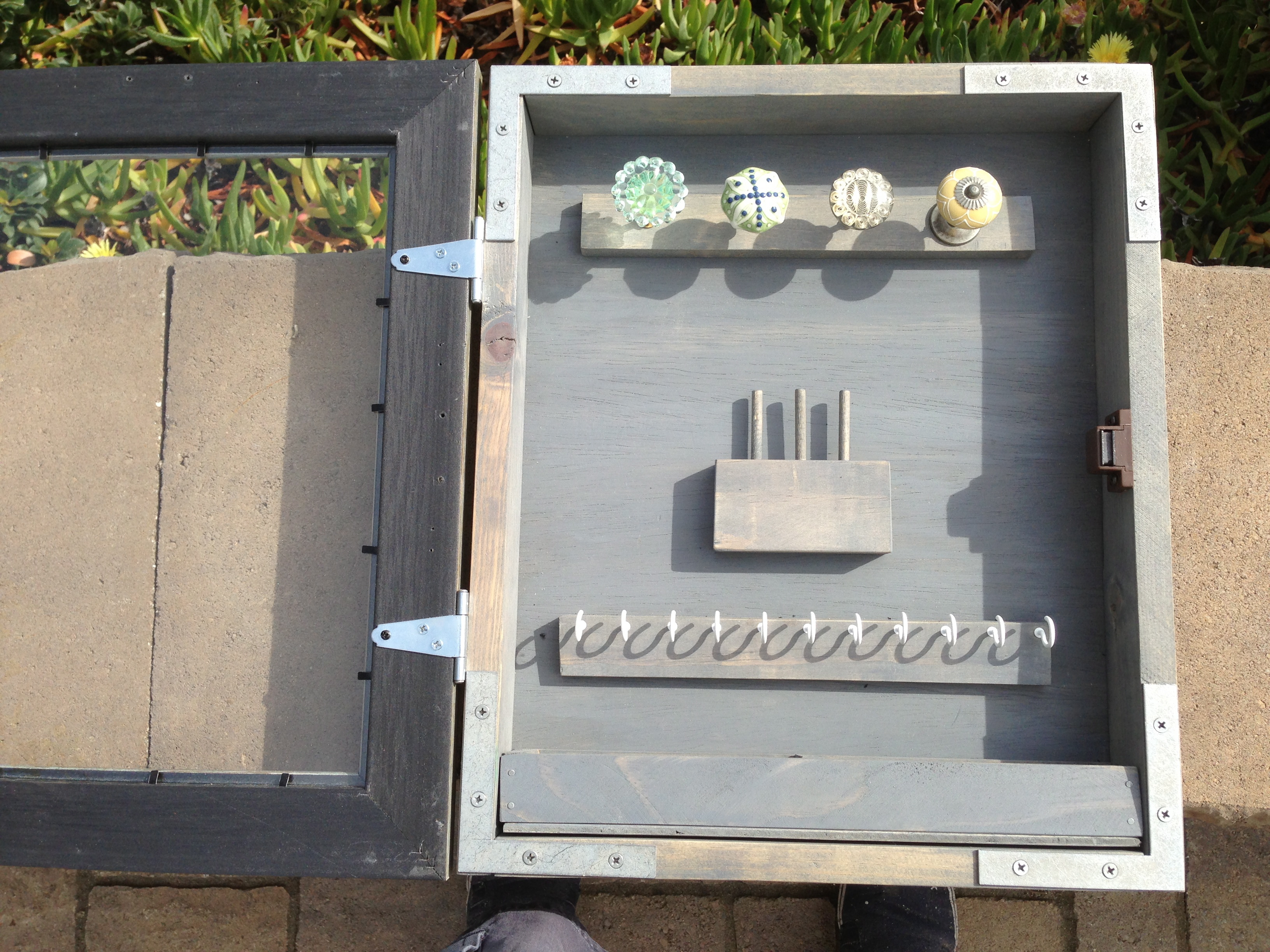 I bought the wood and parts at the local Home Depot (my fave), and luckily had some gray stain from my shelf project that matched wonderfully! I also had my wife head to Anthropologie (her fave) for some overpriced-yet-cool cabinet knobs, which would later become the necklace holders.