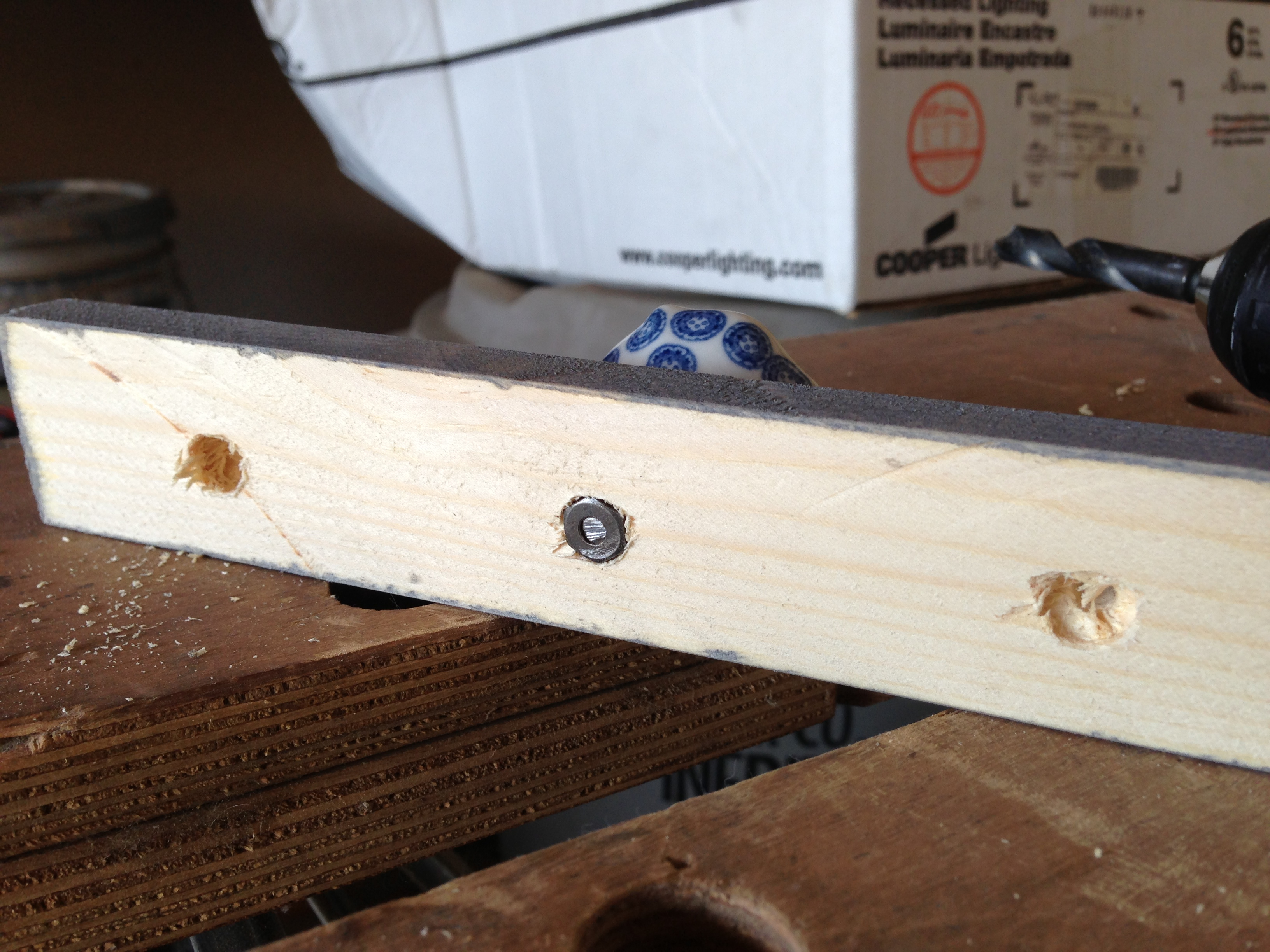I grabbed a hack saw and cut the shaft in half. Then, I used a metal grinder to tame down the edges so I wouldn’t slice my finger. With a bit of drill-work with my trusty Makita, I made some countersink holes so that the nut could sit flush on the underside of the “knob-strip”. NOTE: most knobs don’t come with 2 nuts, so you will need some extras if you’re going to do what I did here.