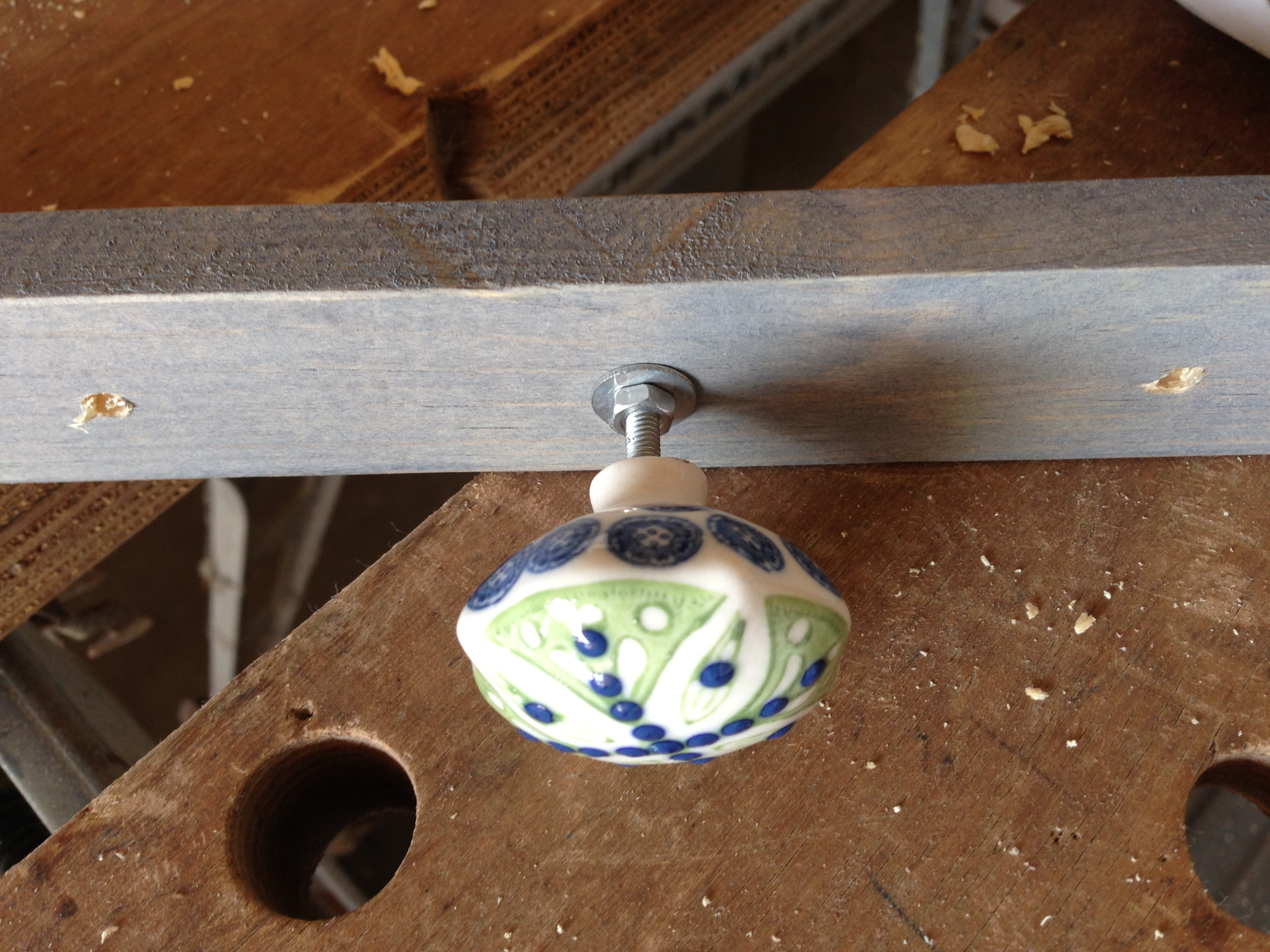 The knobs were great, but when she brought them home, I realized a slight miscalculation. Since the knobs were for doors and cabinets, the bolt shaft of the knob was long (enough to fit through the width of a door). Since the back of my jewelry box was going to be flush, and the depth of the box was only about 3 inches, this bolt had to be shortened. I grabbed a piece of stained 1×2 scrap and cut it to fit the 4 knobs, then drilled holes in them to fit each knob.