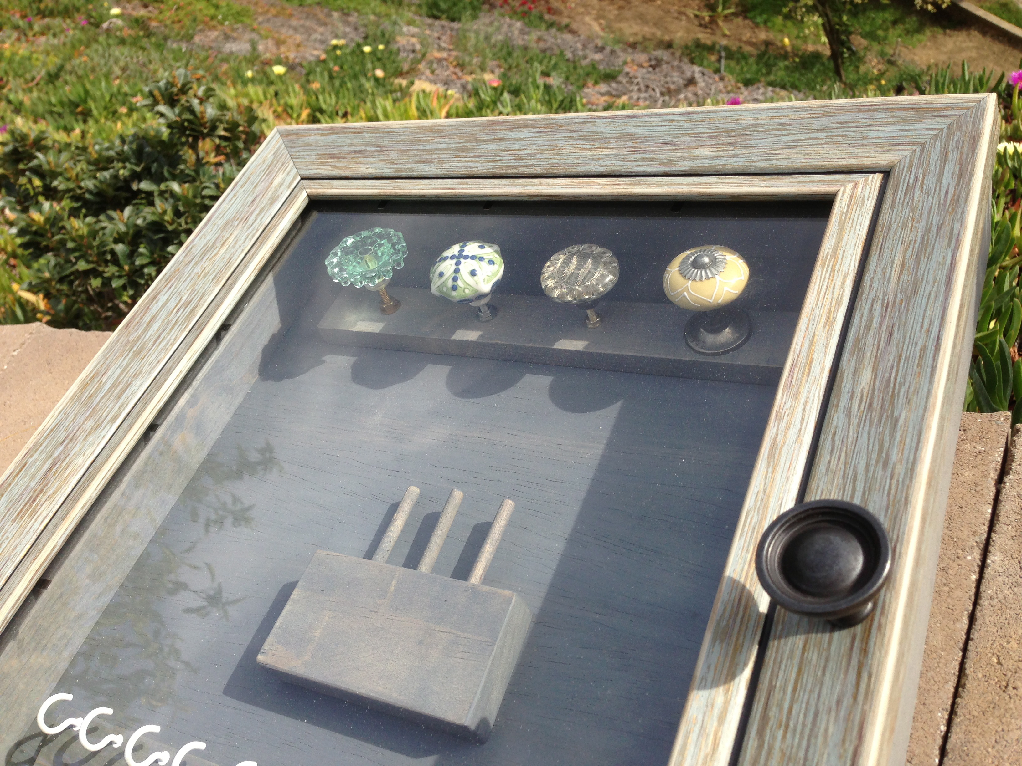 I decided to put the glass from the frame back on. This made the door a lot heavier, but I like that it keeps jewelry from falling out the front. It looks good without the glass too, so I guess this is a matter of preference. Since the magnet to keep the door shut is so strong, I also needed a knob for opening the box. Home Depot had a great distressed metal one for pretty cheap!