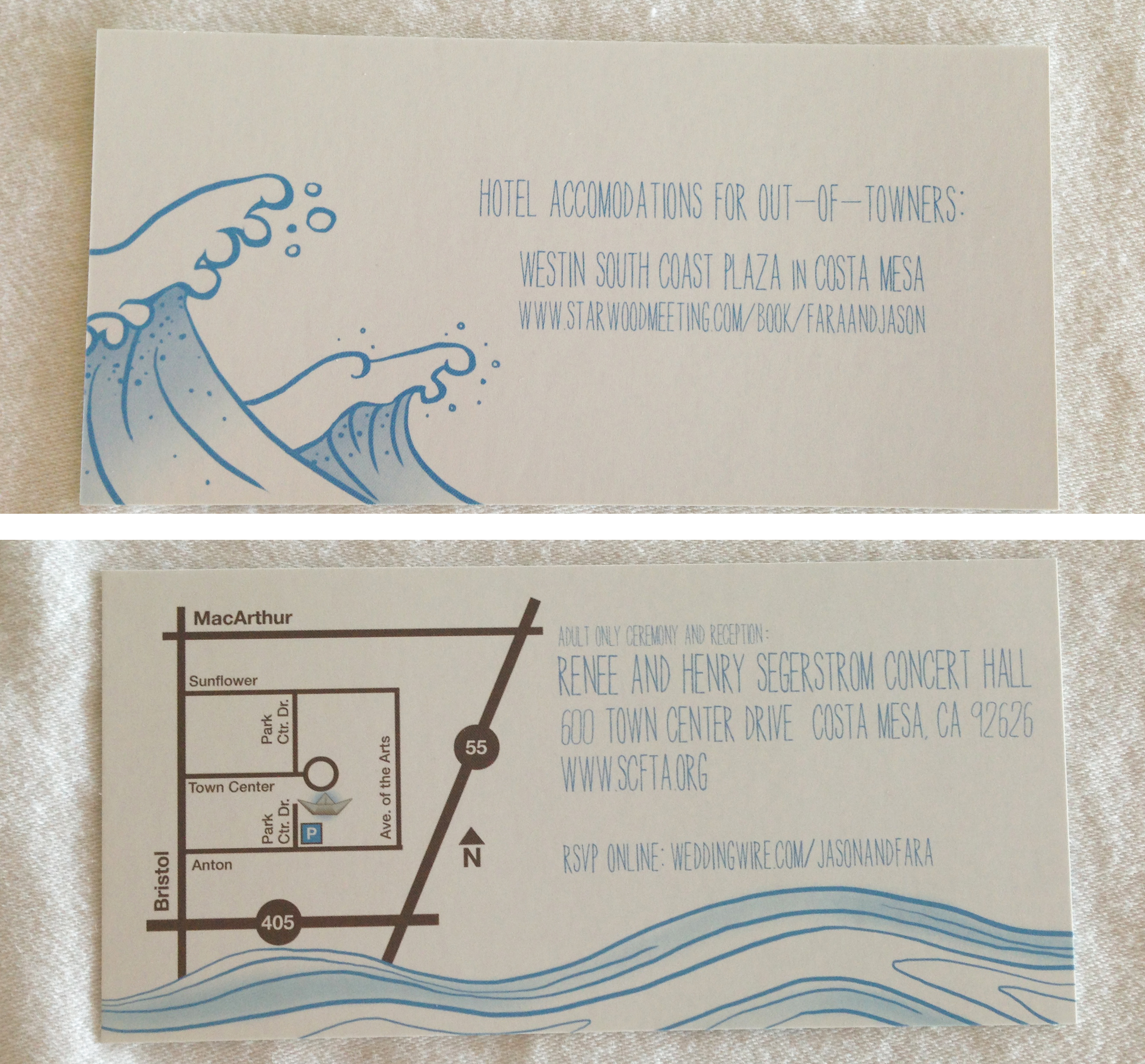 1. I love how you incorporated the Japanese wood block print into the design on of your wedding invitations. I also like how you did not make the set “matchy-matchy” with each piece showing different parts of the wave. What font did you use for the wedding details? Makes the wedding feel welcoming and friendly.