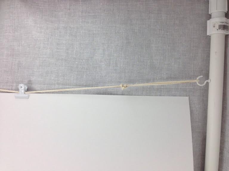 After the frame was constructed and fabric was attached, we tried placing the poster board in the box and realized that it did not stay in place. The instructions called for some support to be placed in back of the box, but in order to make our boxes a little more self-sufficient, we got some string and screw hooks and rigged a support/poster-holder on the back two legs. How far down you place this will depend on the posterboard you get, so measure accordingly. Attach a small clip to the string, and you can hang the board so that it drapes down nicely for the backdrop. We also used a large office clip to hold the front of the muslin to the pvc pipe.