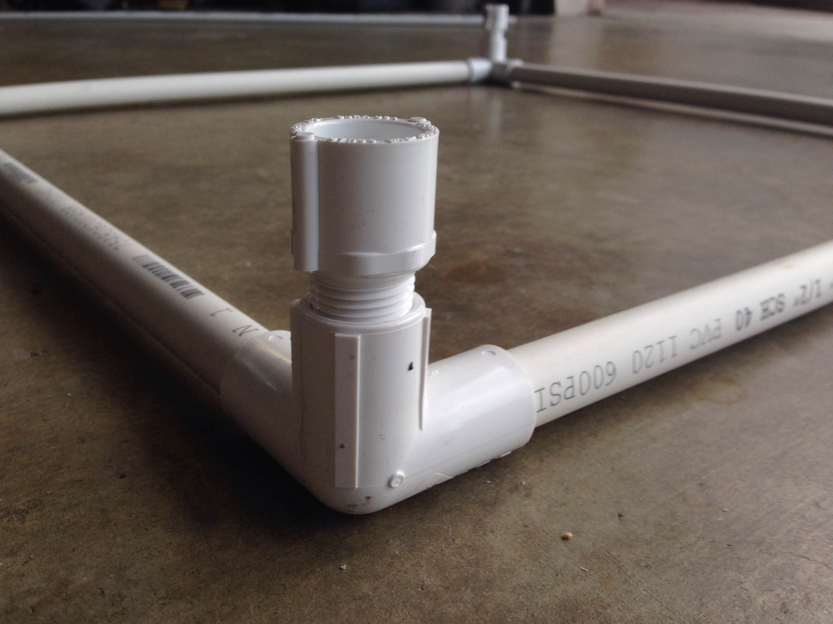 One special tweak we made: our two boxes can join together and make a wider lightbox twice the size. Tina foresaw the need for a bigger box from time to time, so we picked up a few of these T-adapters while at Home Depot. If needed, we can rearrange the pipes of the two lightboxes and form this: