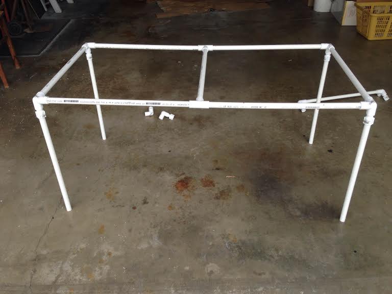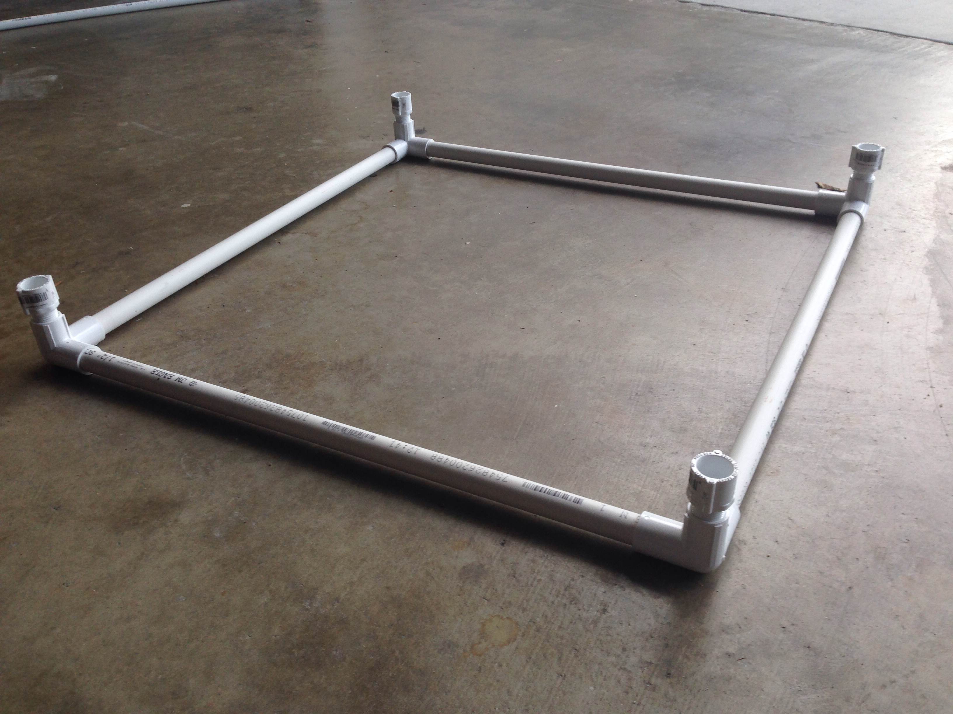 We purchased all of our materials based off of Amanda’s plans for a box using 22″ pipes. We ran into our first snag at Home Depot: the 3-way elbow fittings they had were different – only two of the fittings were slip fitting, and the third was a taped side outlet (see here). We were forced to adjust our measurements on the spot, and add slip fitting adapters (~$1/each) to the shopping list. We returned home and began fabrication of the lightbox. Tina handled the fabric, I handled the pipes. I began by measuring and cutting using a hacksaw, then sanding down the pipes to remove the frayed edges. I had to cut off an extra 2″ off the legs of the box in order to account for the slip adapters. I cut 8 pieces for each box: (4) 22″ pipes – for top of box frame; (4) 20″ pipes – for box frame legs. The frame was really easy to assemble.