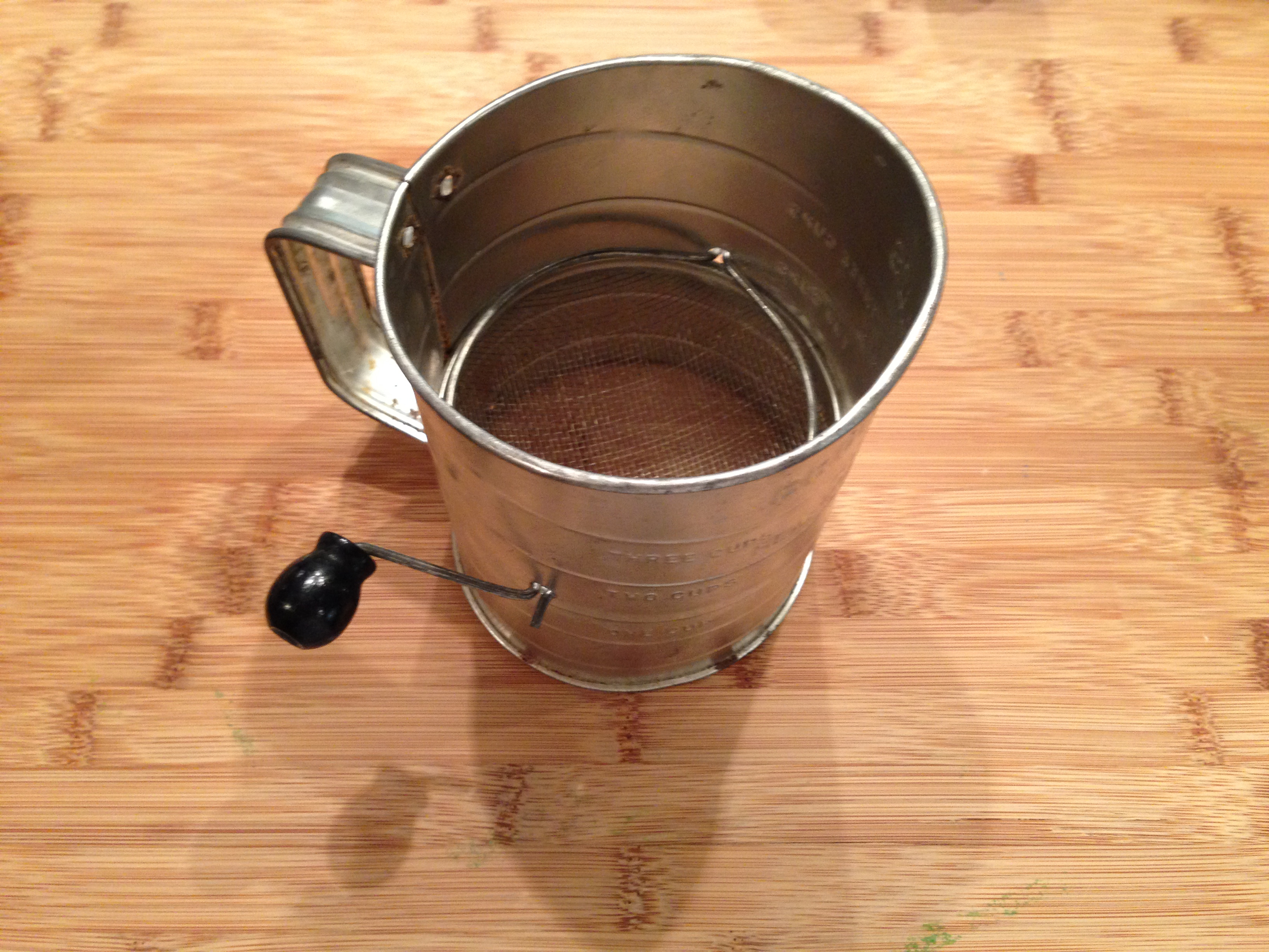 I used this recipe from Alton Brown as my base sugar cookie. I misplaced the frosting recipe, but it wasn’t hard. It was a simple recipe using confectioners sugar and the frosting hardened after about 5 minutes. Since I didn’t think of blogging about the baking process, I don’t have any pictures from the actual making of the dough except for this old sifter that belonged to my grandma.