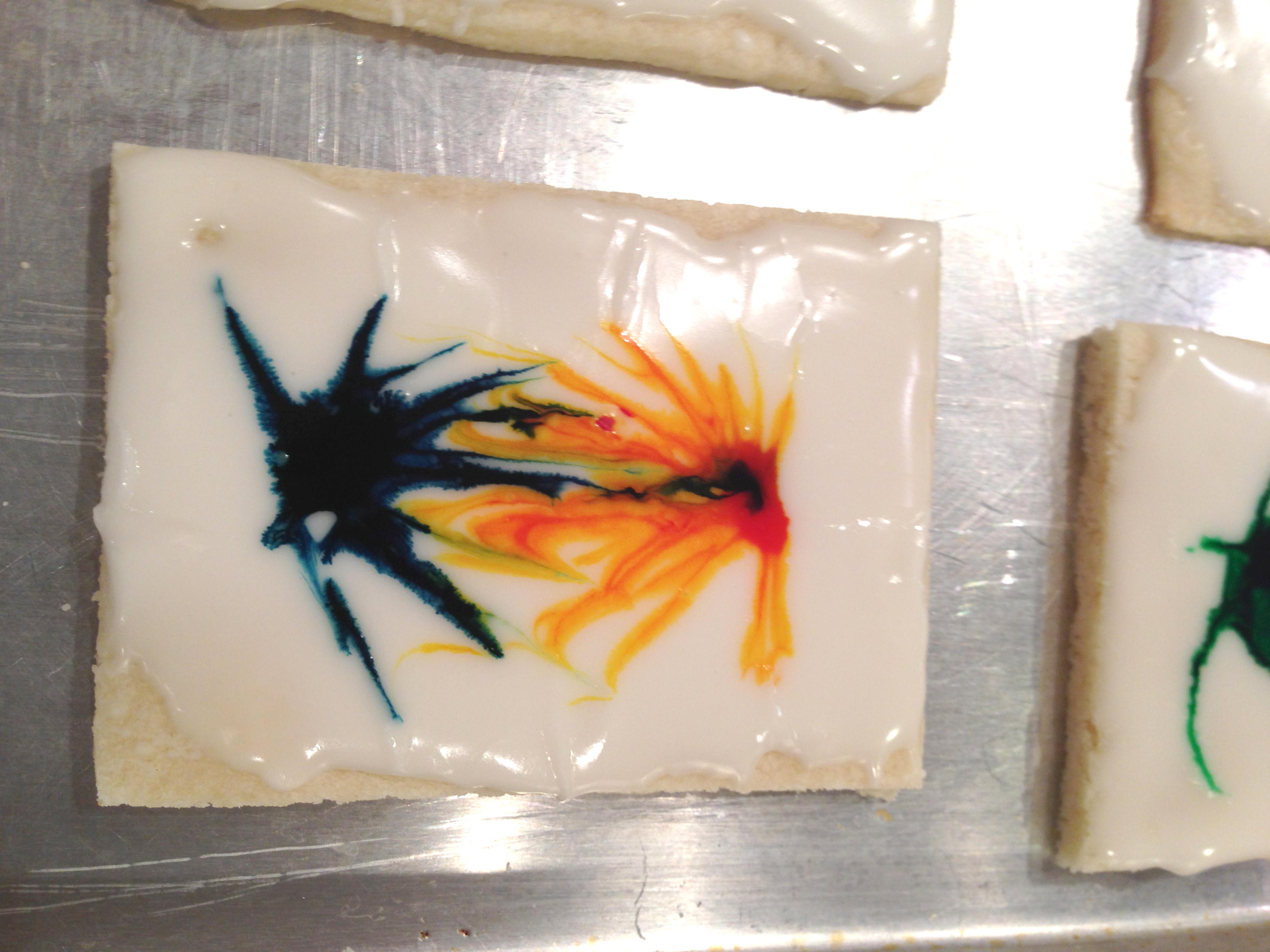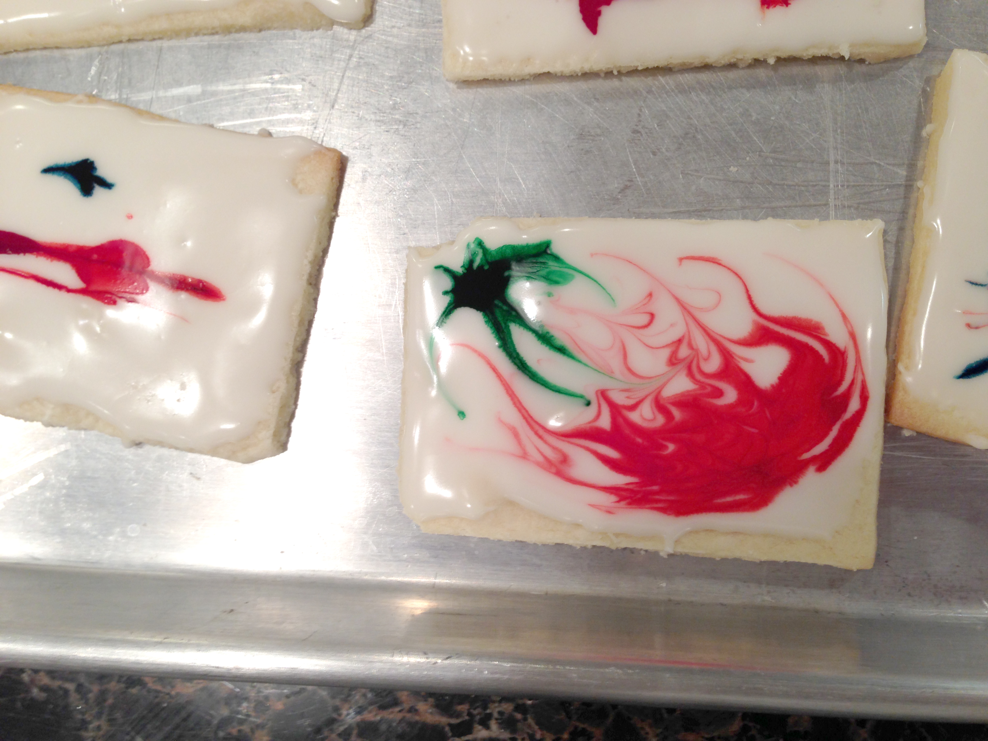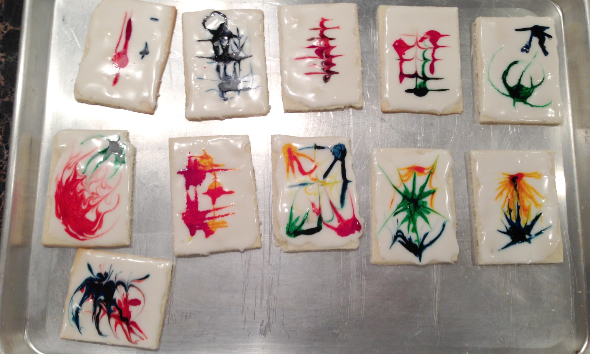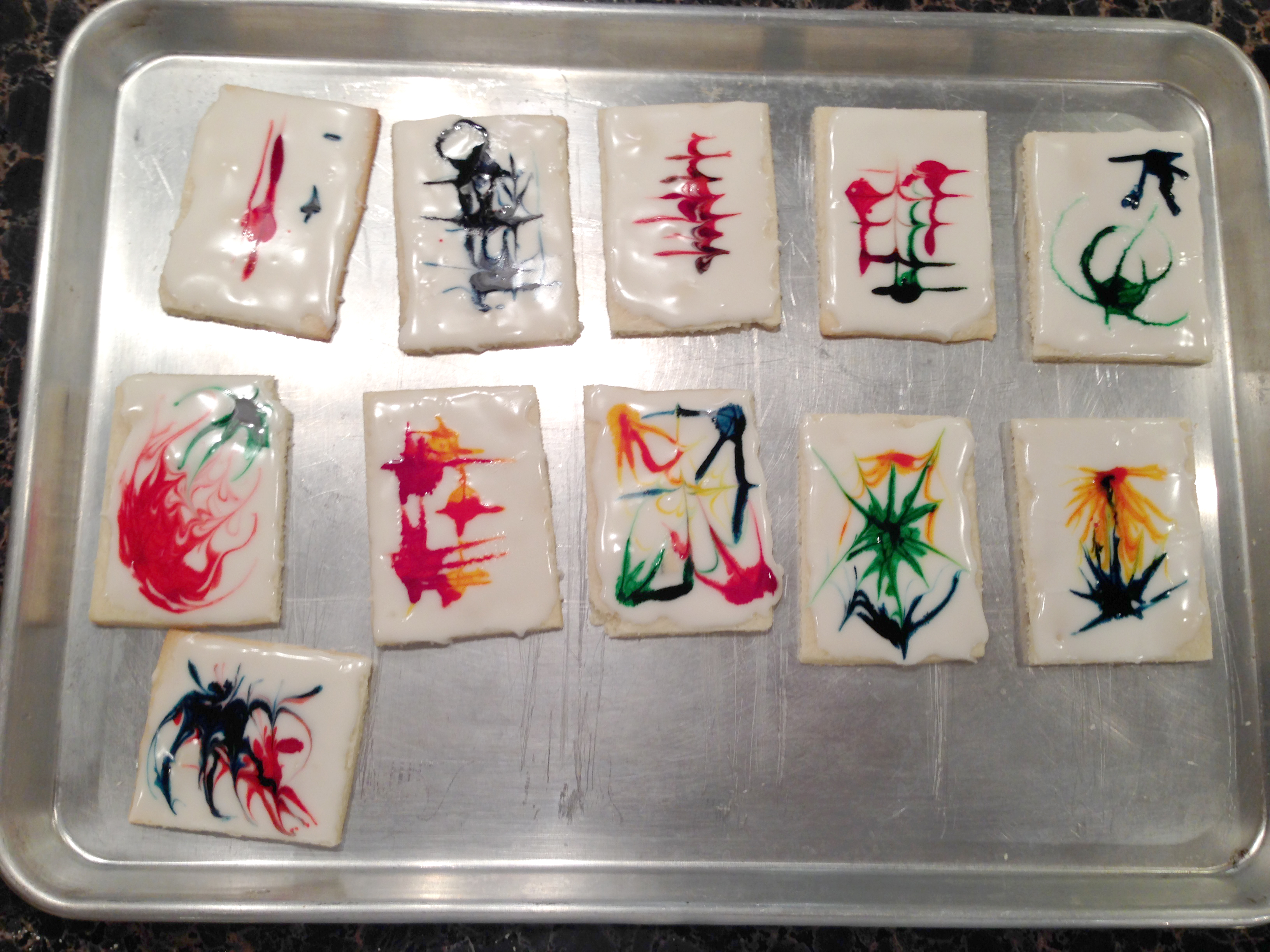 I cut the cookie dough to the size of a standard ATC and baked them in the oven. As expected, the cookies came out looking like ATC blobs rather than cards. I took a regular paper ATC card, and trimmed the excess cookie off so that each cookie was the size of a standard card. Next I coated the card with frosting to be my blank canvas. Finally, drip a few drops of food coloring onto the “canvas” cookie. Swirl/draw/create with a toothpick or other tool… and you should have your own modern art piece! Only coat one cookie at a time, as the frosting hardens within a few minutes. You need the frosting very soft when you add the food coloring. Try mixing colors to get a cool effect on the cookies.